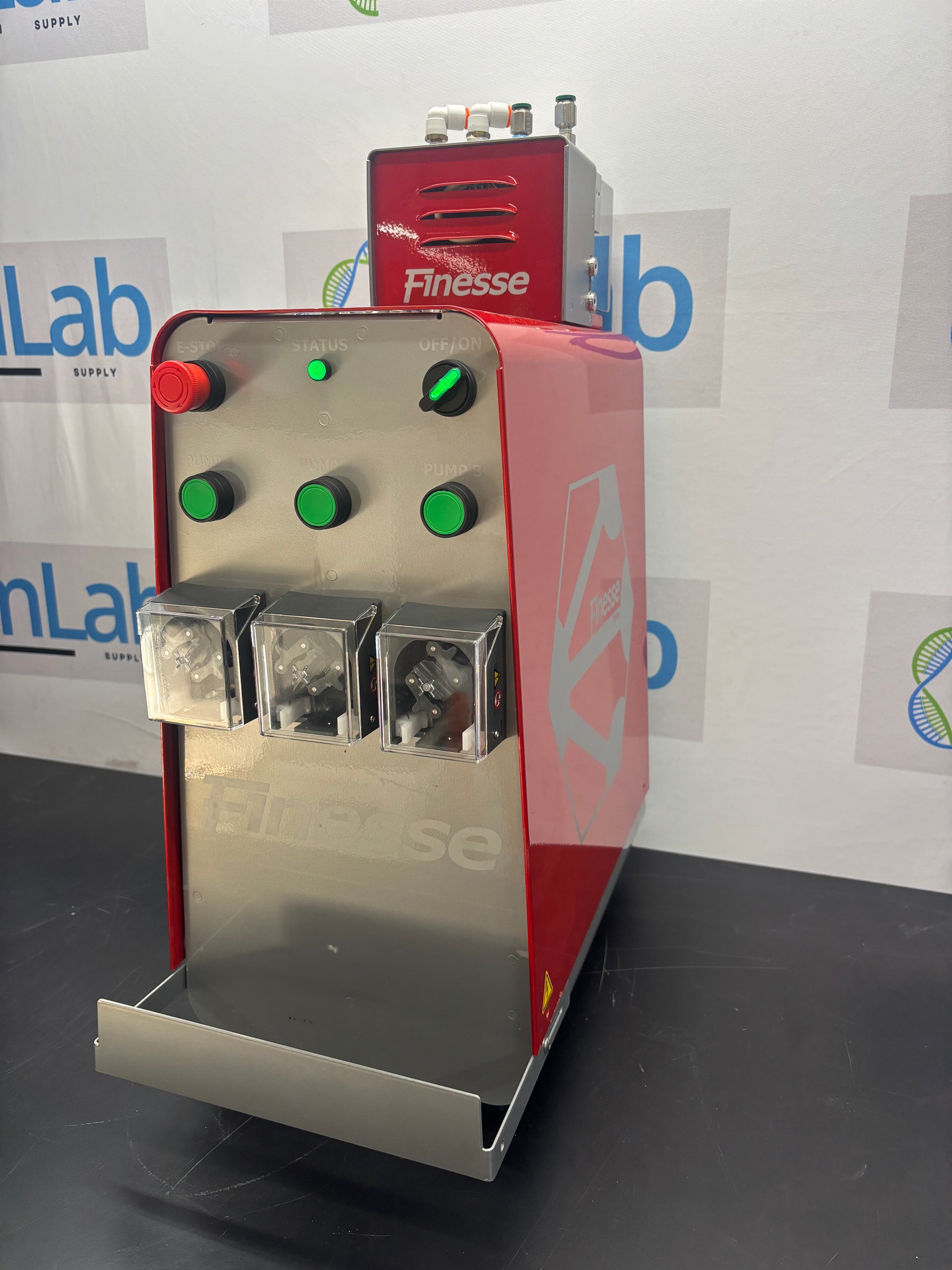 This listing includes a Finesse TruViu™ RDPD modular bioreactor control system in green with integrated peristaltic pump tower, a 4-channel FTC utility module, and a Finesse motor drive for bioreactor mixing. Originally developed by Finesse Solutions and now supported under Thermo Scientific’s TruBio® platform, this system is designed to deliver modular, flexible, and space-saving control for lab-scale cell culture and fermentation.